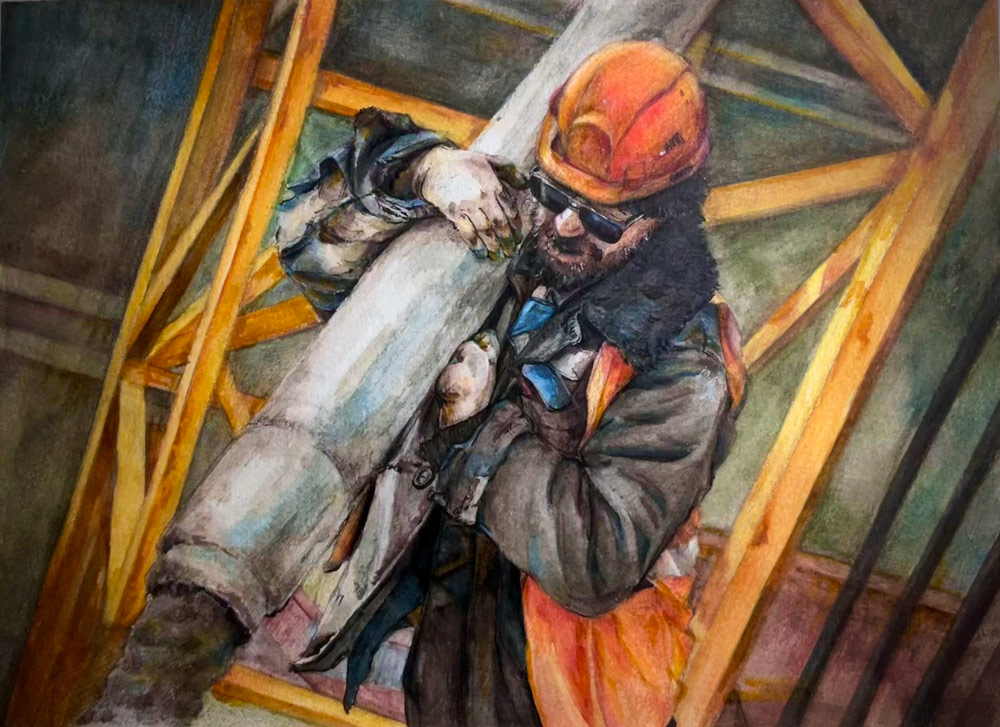 My work Spine of Steel is a watercolor painting that takes a construction worker as its visual focus. By capturing a moment of his labor, I make visible the individual effort behind urban construction—effort that is often overlooked. Through my brushstrokes, I highlight the dignity of work, using this to deeply interpret the spirit of Labor Arts.